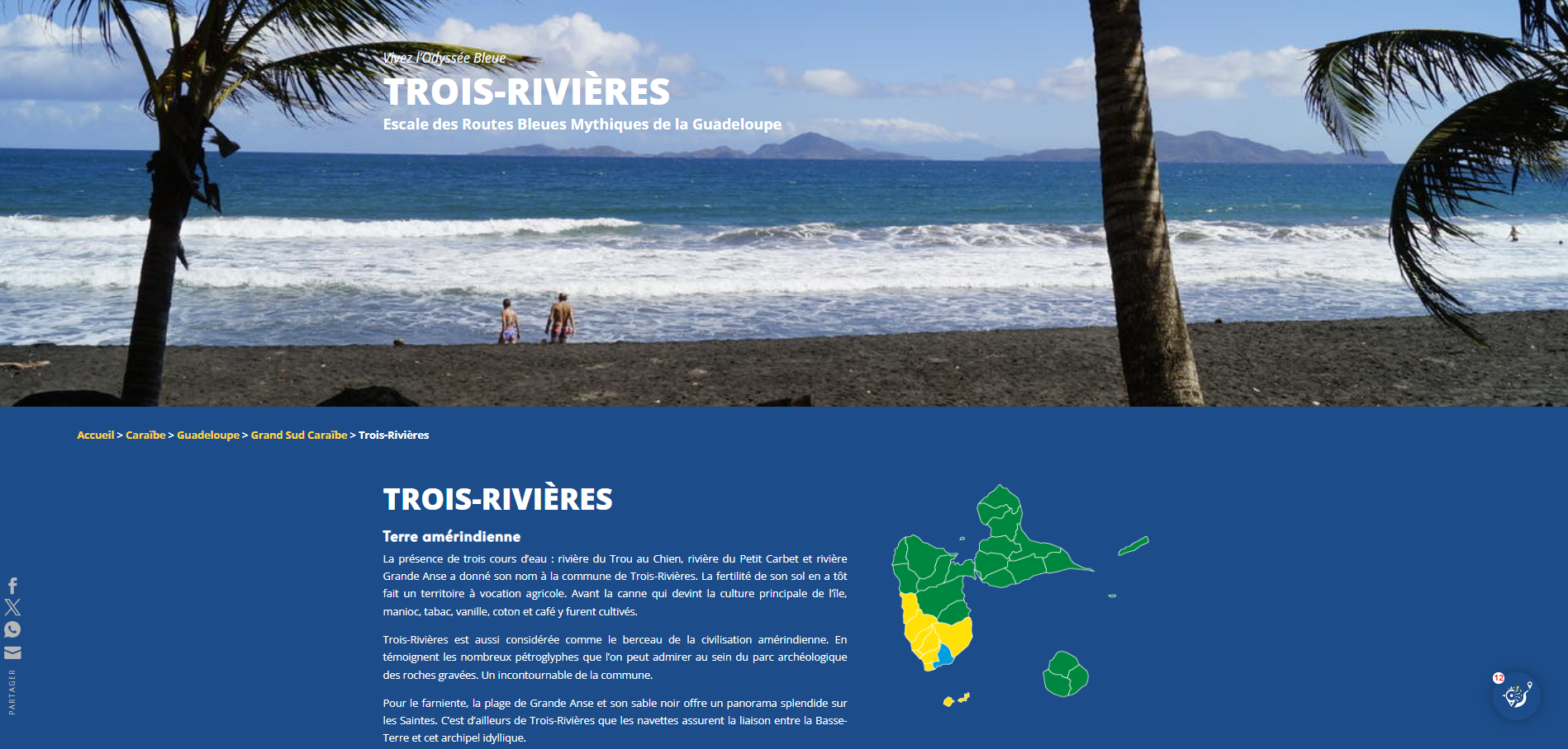 La mise en écotourisme de la destination Trois-Rivières par les Routes Bleues Mythiques du Patrimoine et de la Biodiversité se fera en étroite collaboration avec l’Office de Tourisme Intercommunal Grand Sud Caraïbe et le Comité du Tourisme des Îles de Guadeloupe.