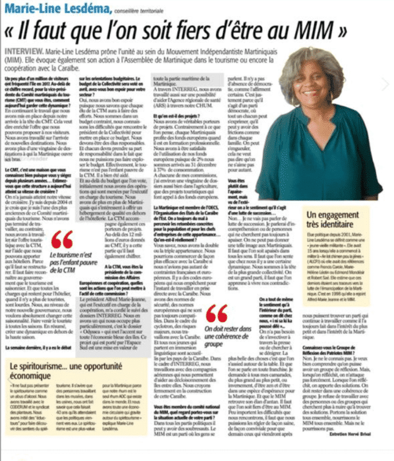 A la question « A la CTM, vous êtes Présidente de la commission des Affaires européennes et coopération, quelles sont les actions que l’on peut mettre à l’actif de cette commission ? », Madame Lesdéma répond : « Le Président Alfred Marie-Jeanne, qui est l’exécutif en charge de la coopération, m’a confié le suivi des dossiers INTERREG. Nous en avons un qui nous occupe plus particulièrement, c’est le dossier « Odyssea » qui met l’accent sur toute l’économie bleue des îles. Ce projet qui est porté par l’Espace Sud est une mise en valeur de toute la partie maritime de la Martinique… ».