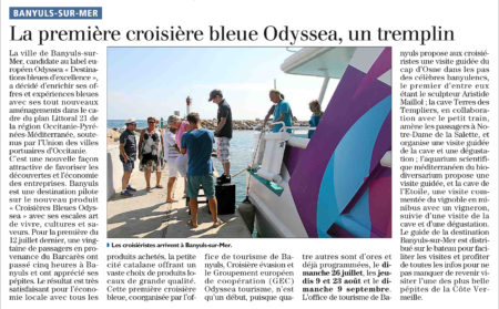 Banyuls-sur-Mer est destination pilote sur le nouveau produit « Croisières Bleues Odyssea® » avec ses escales Art de vivre, Cultures et Saveurs. Le quotidien local L’Indépendant a publié un article sur la 1ère croisière du 12 juillet, à l’occasion de laquelle une vingtaine de passagers en provenance de Port-Barcarès ont passé 5 heures sur Banyuls et ont pu apprécier ses pépites, citées dans l’article.