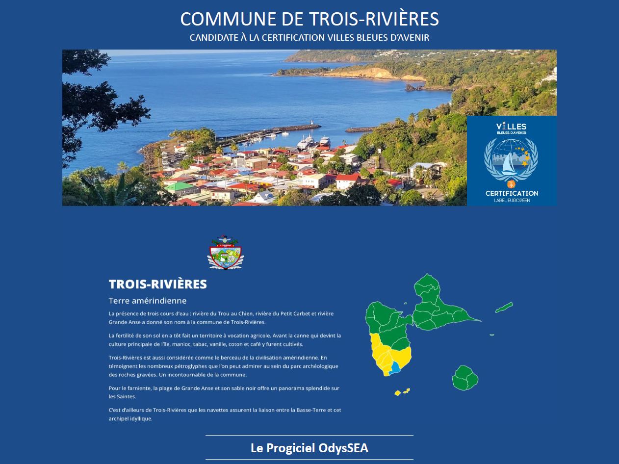 Ce travail est réalisé dans la continuité de la présentation à tous les acteurs locaux du projet territorial « Trois-Rivières, Terre Amérindienne, Ville Bleue d’Avenir, Capitale Patrimoine de la Mer », qui s’est tenue en mars dernier et qui était organisée par la commune de Trois-Rivières. Dans un objectif de croissance économique et d’emploi d’avenir, la commune engage des investissements autour de son héritage culturel et patrimonial vu de la mer, de ses savoir-faire, traditions et la valorisation de ses bonnes adresses. Elle entend accompagner ses entreprises, acteurs et associations du Tourisme Bleu durable, dans le progrès du numérique, de la transition écologique, la mise en réseau des expériences de leur activité, la création d’un marketing de conquête, la valorisation de la destination sur des offres, des activités et des services manquants, à l’exemple de la création de Week-ends Bleus Mer, de courts séjours, et de parcours touristiques sur l’ensemble du territoire côté mer et terre avec l’innovation : « Les Routes Bleues du Patrimoine et de la Biodiversité, Blue World Heritage »*.