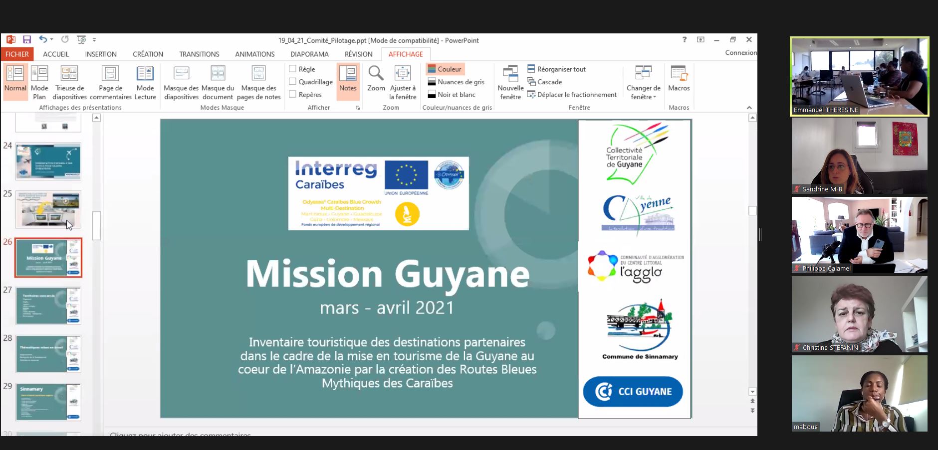 Les partenaires guyanais se sont réunis, avec l’Espace Sud Martinique, chef de file du programme Odyssea Blue Growth, et la Scic GE Odyssea, le 19 avril dernier, afin de faire un point sur les actions en cours et celles à réaliser pour faire de la Guyane une Destination Bleue et Verte d’excellence, ainsi que pour un point administratif dans le cadre de ce programme de coopération territoriale européenne.
