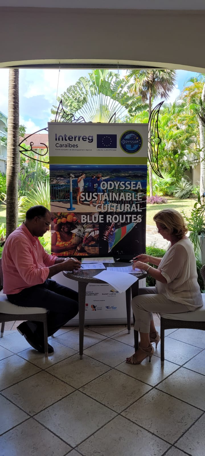 C’est au sein du très bel hôtel La Pagerie, aux Trois-Îlets, qu’a été signée la convention de coopération pour le développement de l’économie bleue et du tourisme durable en Martinique, entre la Présidente de l’UMHI (Union des Métiers et des Industries de l’Hôtellerie) de Martinique, Véronique Bidault des Chaumes, et Guy Gamess, Délégué Odyssea Antilles Guyane, Président du Lab’Odyssea Sud Martinique, représentant le Président de la Scic GE Odyssea, Philippe Calamel, aux côtés de Judicaël Chasseuil, Directeur de projets Odyssea.