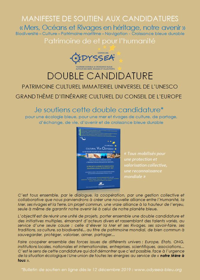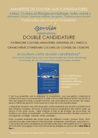 Une première : Le 1er réseau Odyssea des Élus et Maires des Territoires et Villes-Ports et ses partenaires ont engagé officiellement au salon « Nautic » de Paris, le 12 décembre dernier, la candidature au classement à l’Unesco et à la certification au titre des Grands Itinéraires Culturels du Conseil de l’Europe, de notre héritage et histoire vus de la Mer et des Rivages.