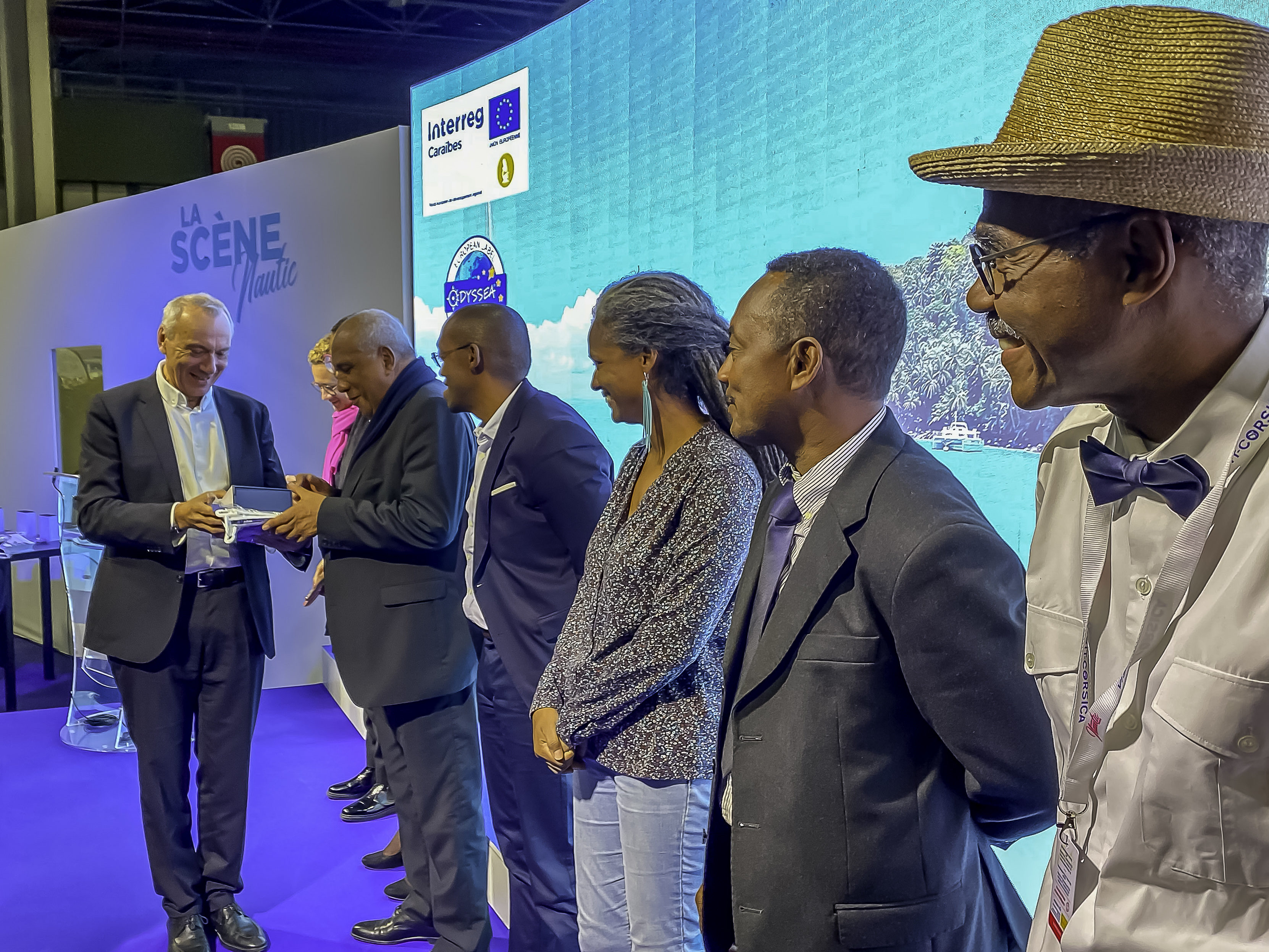 C’est ensuite sur la Grande Scène du Nautic que les partenaires des projets Odyssea Caraïbes Blue Growth Multi-Destination et Odyssea Antilles Sustainable Nautical and Cultural Blue Routes se sont vus remettre les trophées « Candidat au label des Destinations Bleues d’Excellence Odyssea® », en présence du ministère des Outre-mer (Kévin Poveda, Chef du Bureau des politiques agricoles, rurales et maritimes et Solène Le Coz, Chargée de mission Vie économique), des institutions en lien avec la mer, le tourisme, l’environnement en Outre-mer …