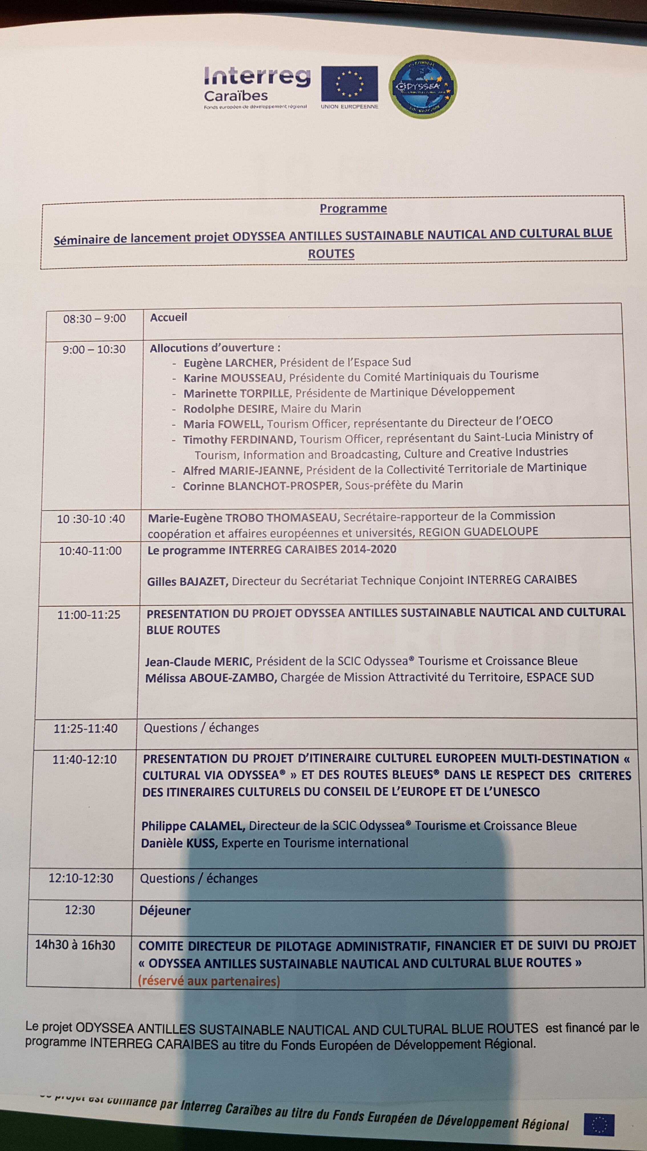 Le séminaire de lancement du projet « Odyssea Antilles Sustainable Nautical and Cultural Blue Routes », approuvé dans le cadre du programme de coopération territoriale européenne Interreg Caraïbes, s’est tenu le 18 février 2019, à Sainte-Luce, en Martinique, en présence des partenaires du projet, des services de l’Europe et du Groupement Européen Odyssea Tourisme et Croissance Bleue.