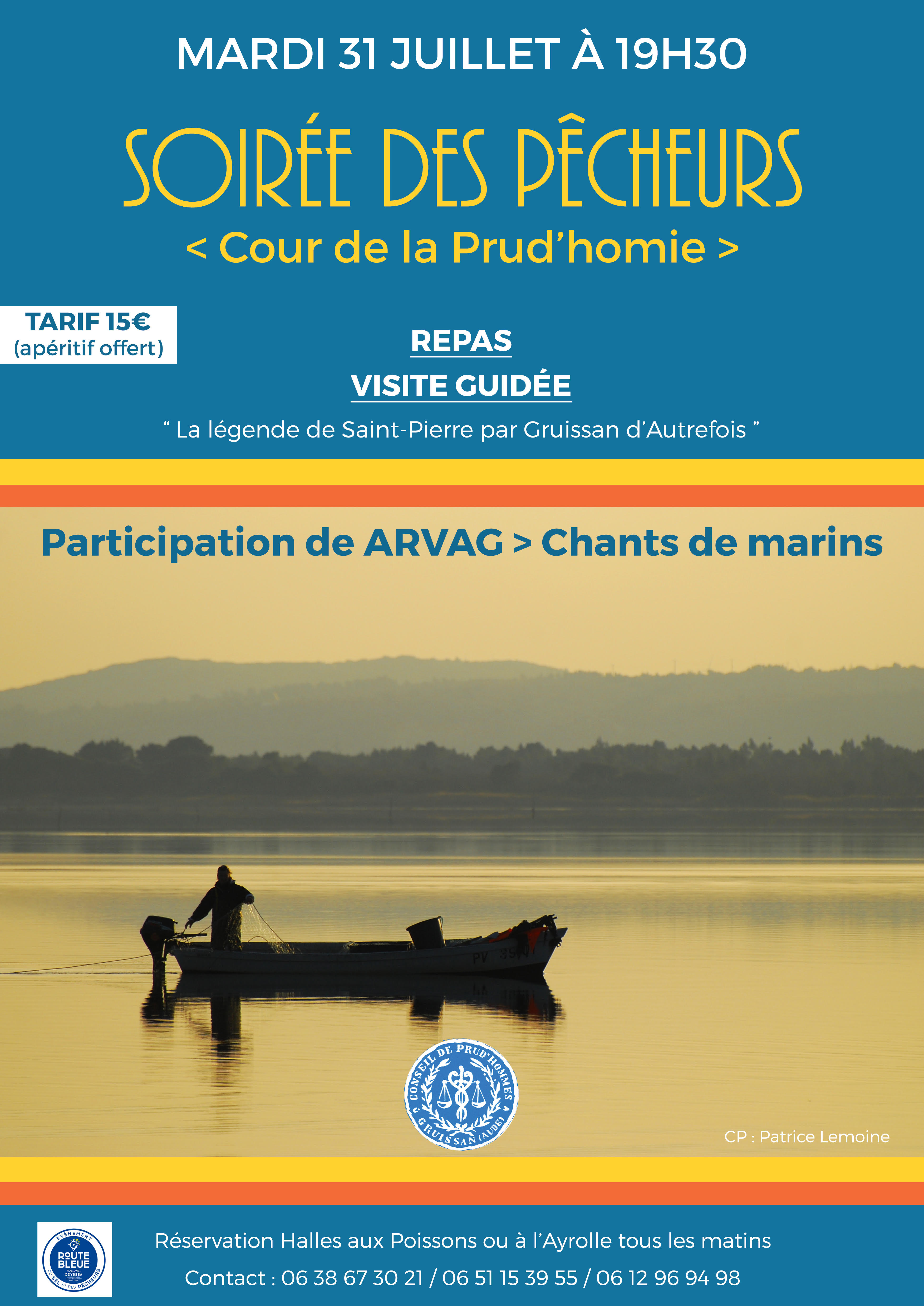 Cet évènement, organisé dans le cadre de la Route Bleue du Sel et des Pêcheurs® de Gruissan, aura lieu le 31 juillet. Les participants pourront se régaler d’un repas autour des produits de la pêche, d’une visite guidée sur le thème « La légende de Saint-Pierre par Gruissan d’Autrefois », et de chants marins.