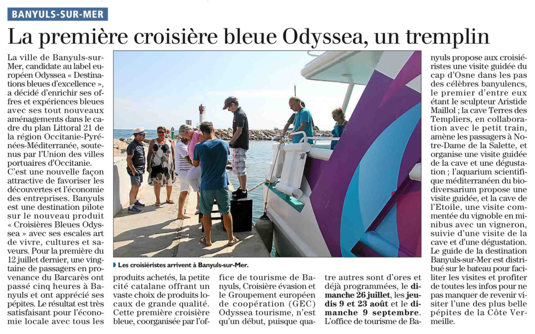 Banyuls-sur-Mer est destination pilote sur le nouveau produit « Croisières Bleues Odyssea® » avec ses escales Art de vivre, Cultures et Saveurs. Le quotidien local L’Indépendant a publié un article sur la 1ère croisière du 12 juillet, à l’occasion de...