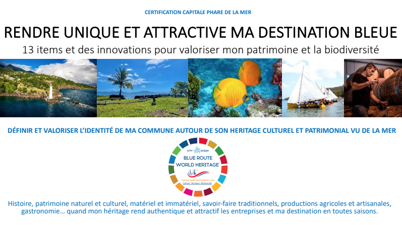 - Une itinérance multi-destination, les Routes Bleues Mythiques élaborées selon les référentiels des Itinéraires culturels du Conseil de l’Europe & des Routes de l’Unesco, qui unissent les destinations par une valorisation de leurs atouts touristiques, patrimoniaux, environnementaux, gastronomiques…, autour de 13 items du patrimoine naturel et culturel vu de la mer et d’une thématique qui se matérialise par l’émergence d’une marque territoriale identitaire.
